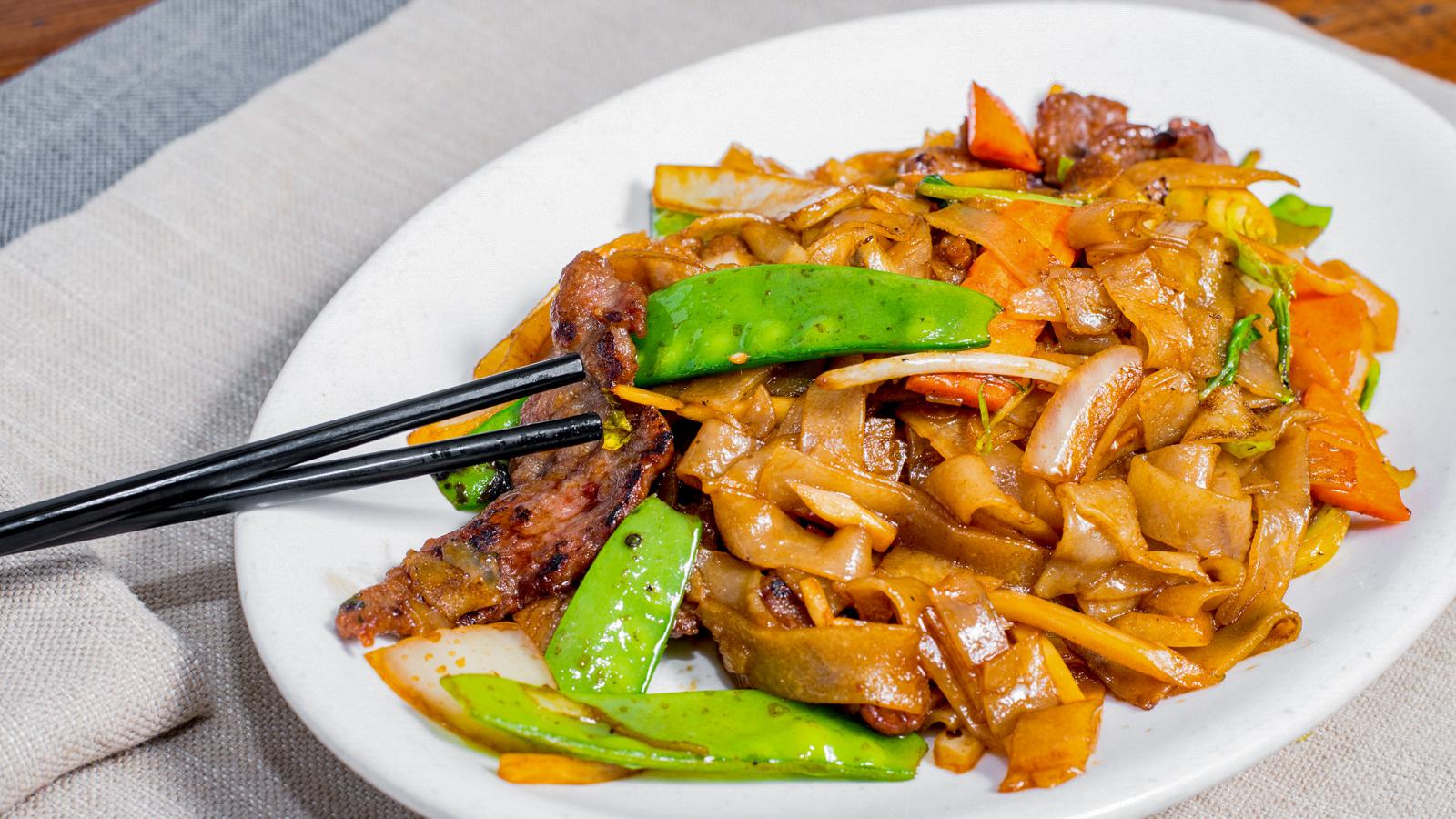 wide flat rice noodles, cabbages, snow peas, onions, scallions || with choice of mixed veggie