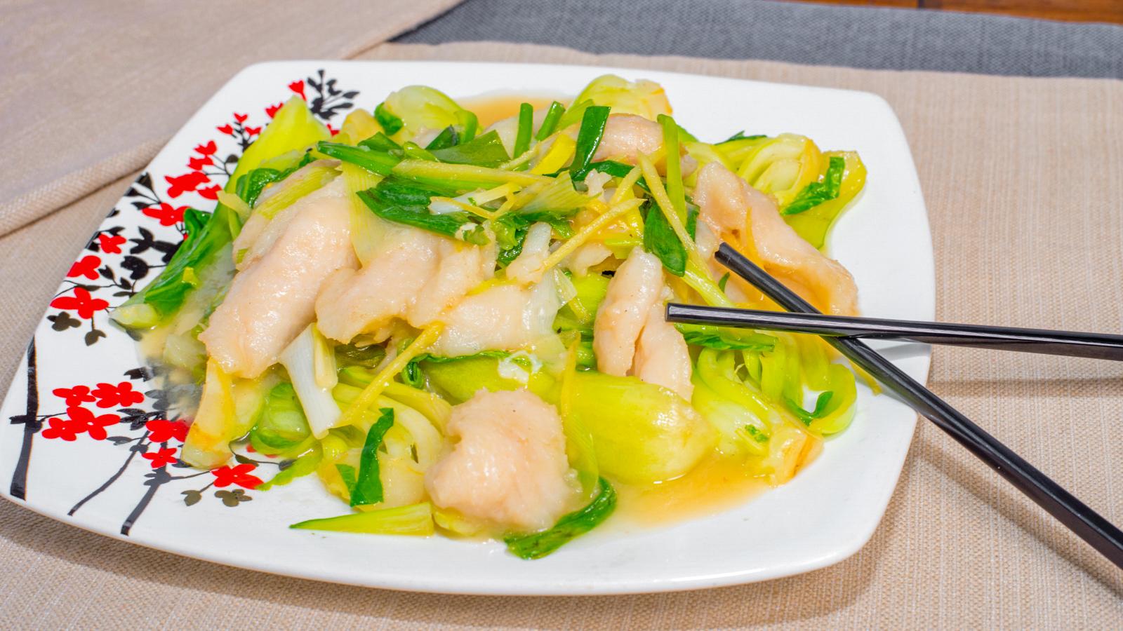 ginger slices, scallions, shanghai bok choy in a savory white sauce
